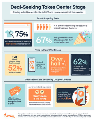 Sept. 15, 2020 /PRNewswire/ -- Honey today released new research exploring the emotions and deal-seeking habits of online shoppers during COVID-19 finding that 58% of Americans have experienced a decrease in household income. Now, there is an immediate need for shoppers to find savings with four out of five (79%) Americans saying discovering a deal is even more important than it was before the pandemic. Gone are the days of aimlessly searching for coupons in the dark as savvy shoppers adopt new behaviors for finding deals that help them buy what they love and need.